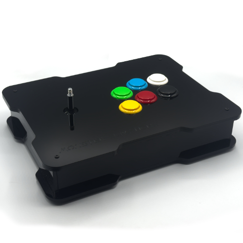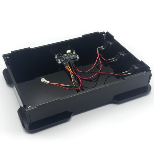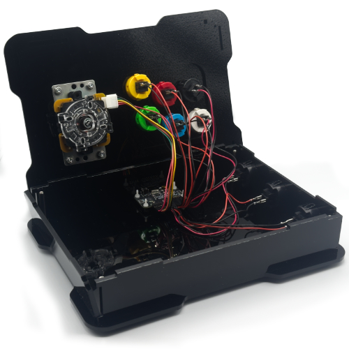 Align and slot in the rear, left and right panels into the base panel of the joystick, please be sure that the side with the shorter dovetails is facing towards the front of the base. You can then insert 3 black black push buttons into the right panel and connect the 2 wire terminal cables to the buttons, then connect the 2 pin dupont connectors on each button to the first 3 pairs of pins from the left side. Now you can attach the 5 pin joystick cable to the first 5 individual pins on the interface PCB, you willl need to attach them in the following order from left to right